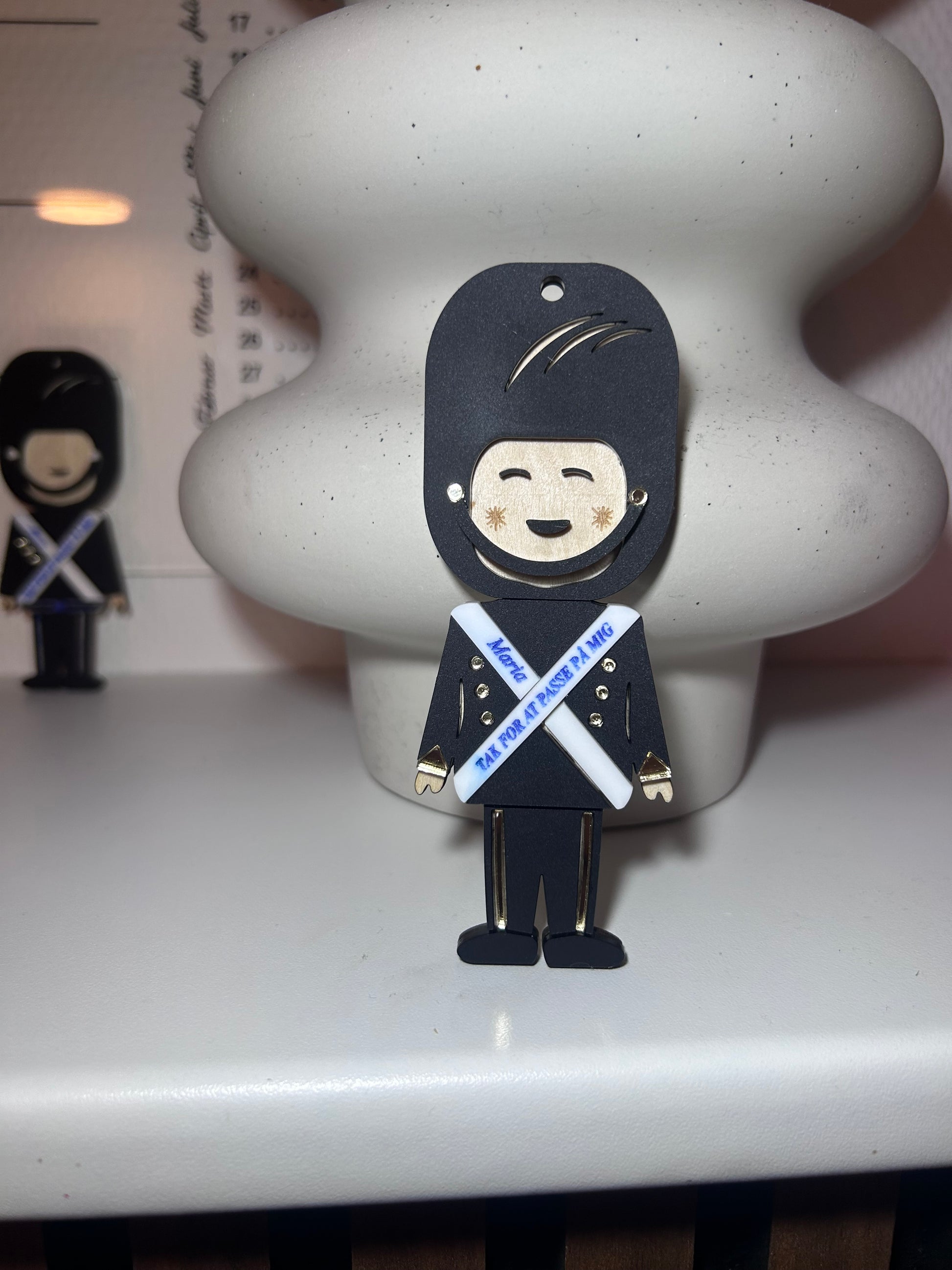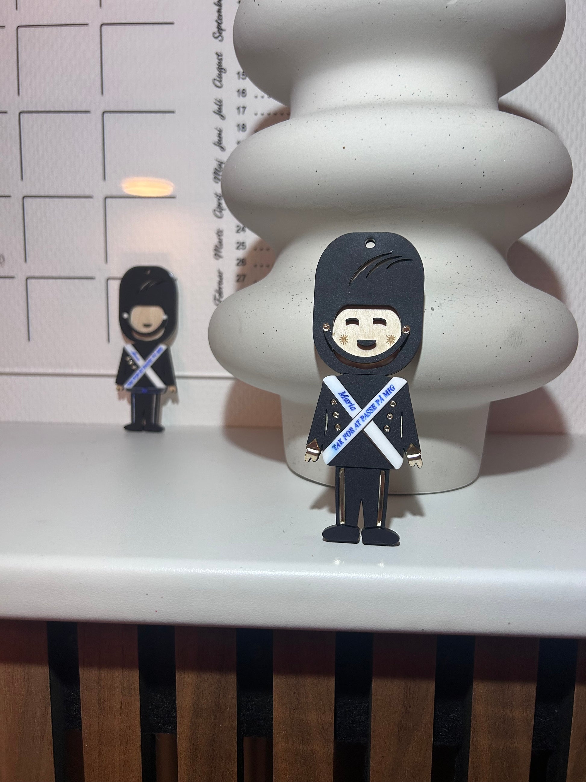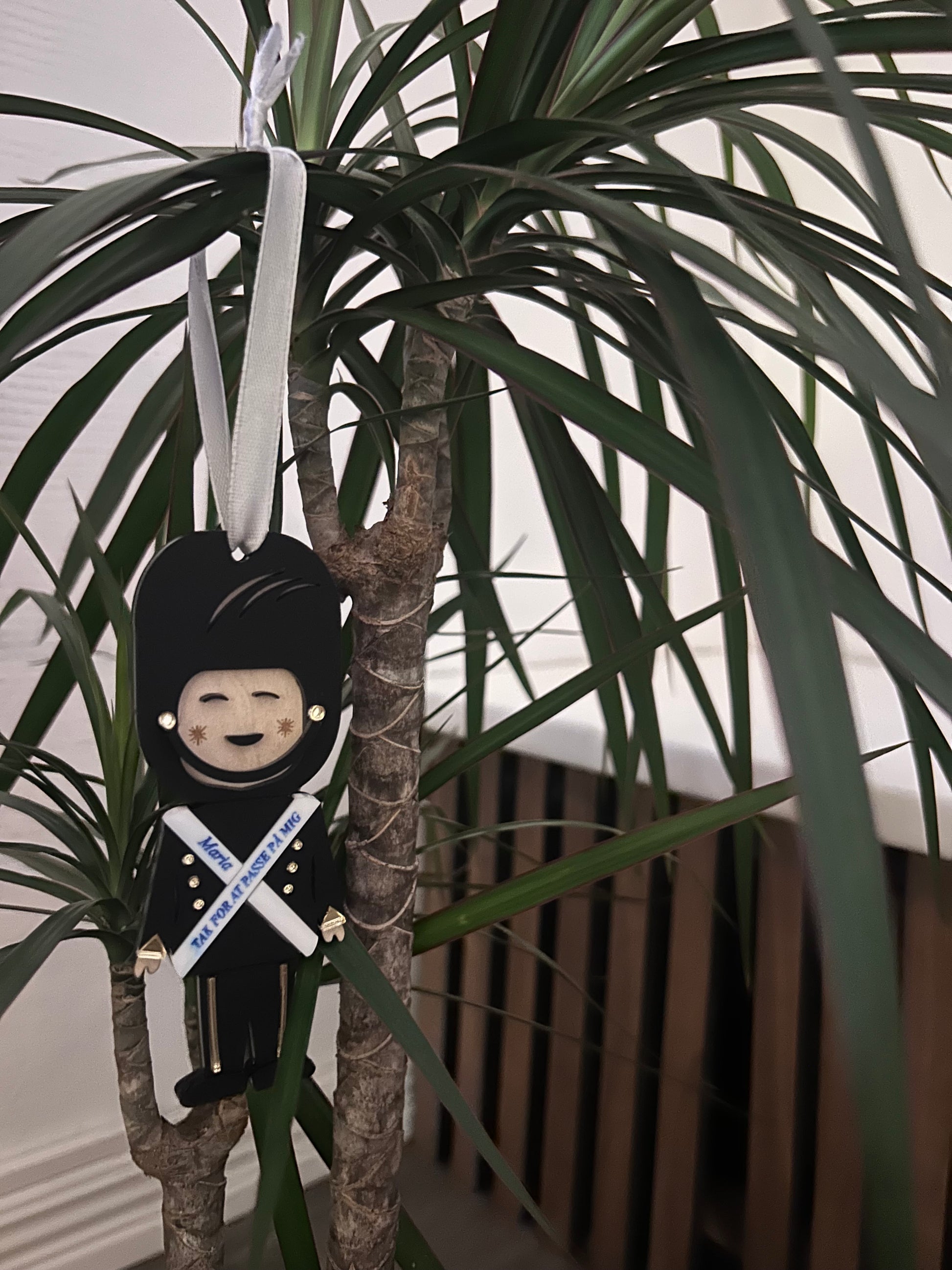 Oplev en garder juleophæng lavet i kvalitetsmaterialer. Garderen er lavet i akryl og birk. Der står graveret “tak for at passe på mig”. Giv den til din dagplejemor, pædagog eller mormor. Få graveret et personligt navn. Brug den til julepynt eller pynt til hele året.