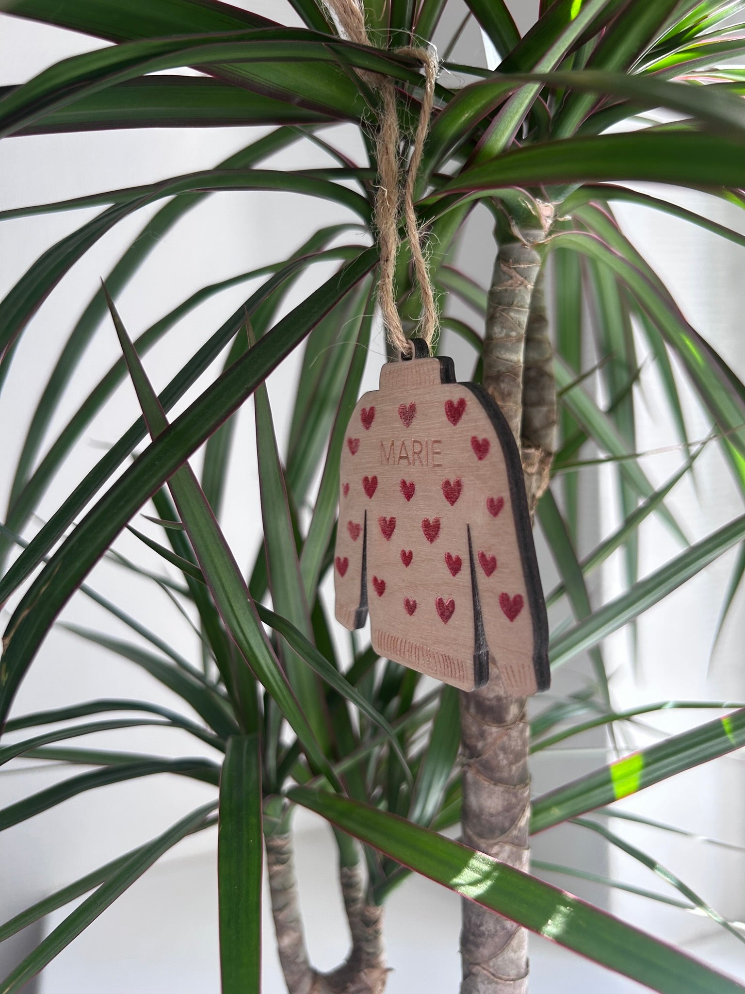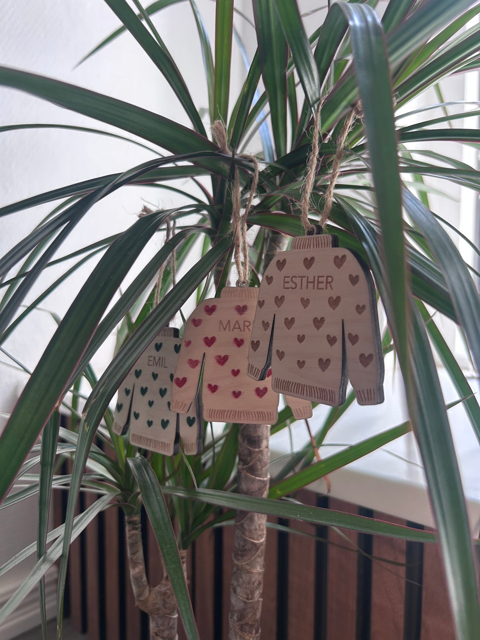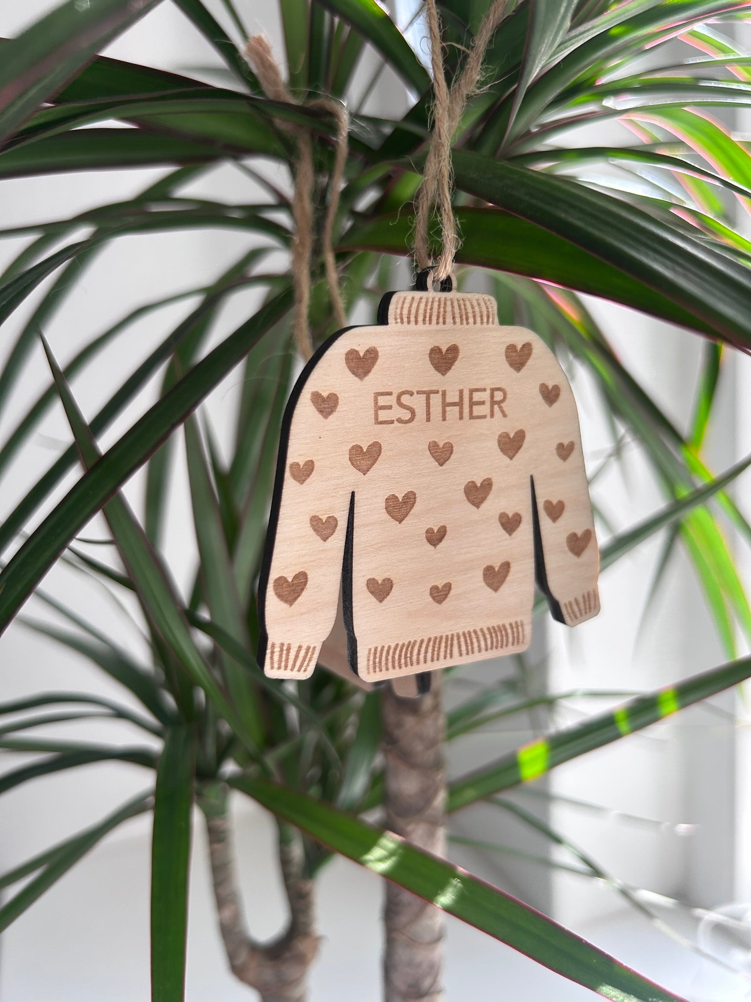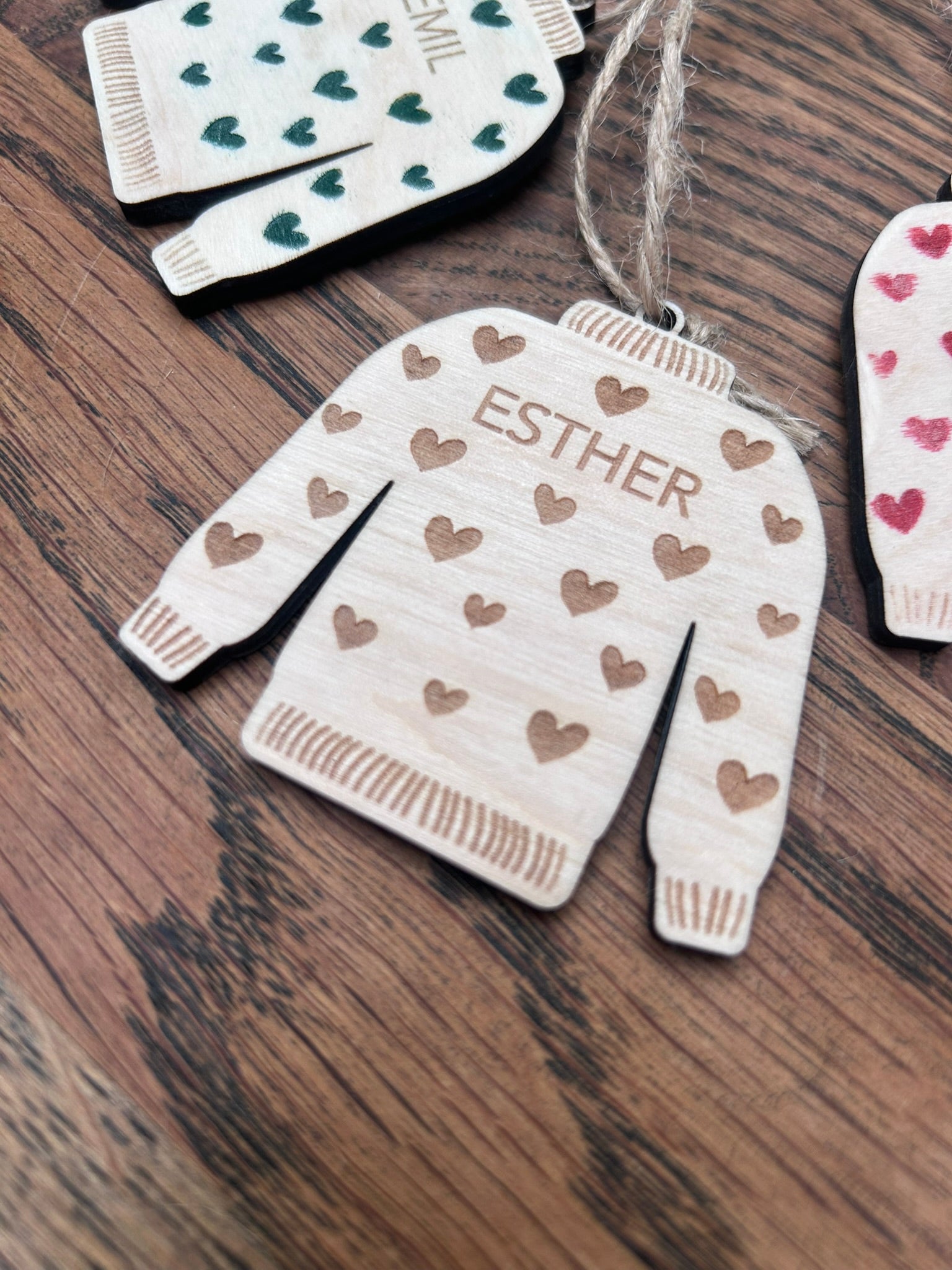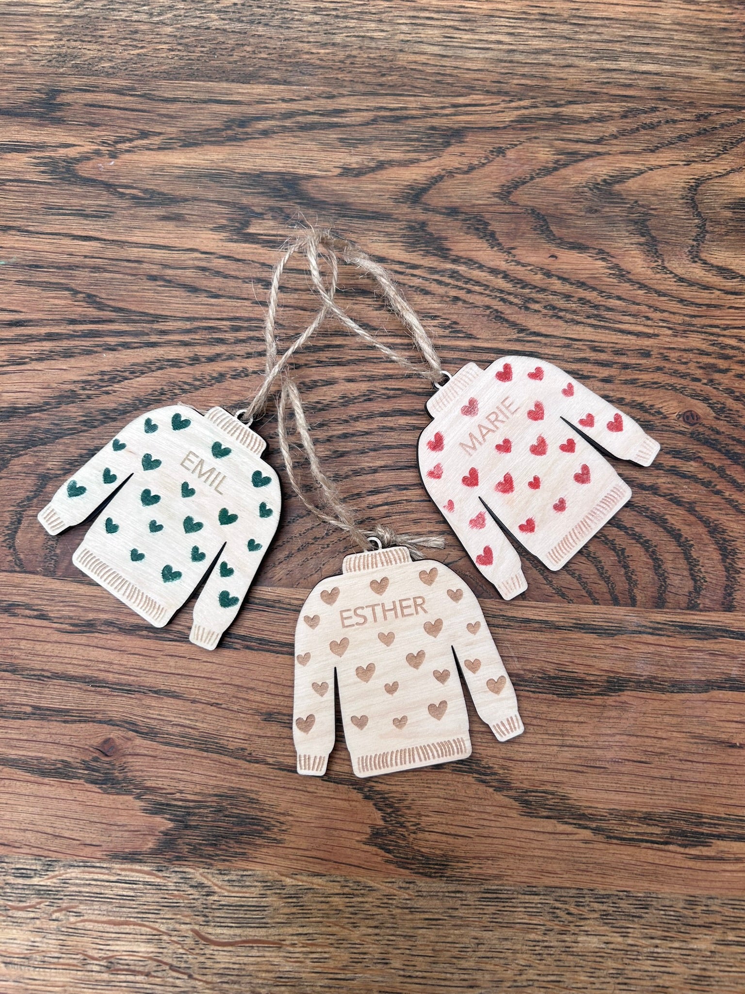 Hvad er mere hyggeligt end en dejlig varm sweater? De smukkeste juleophæng inspireret af hygge. De er udskåret som en sweater og graveret med et personligt navn i birketræ.