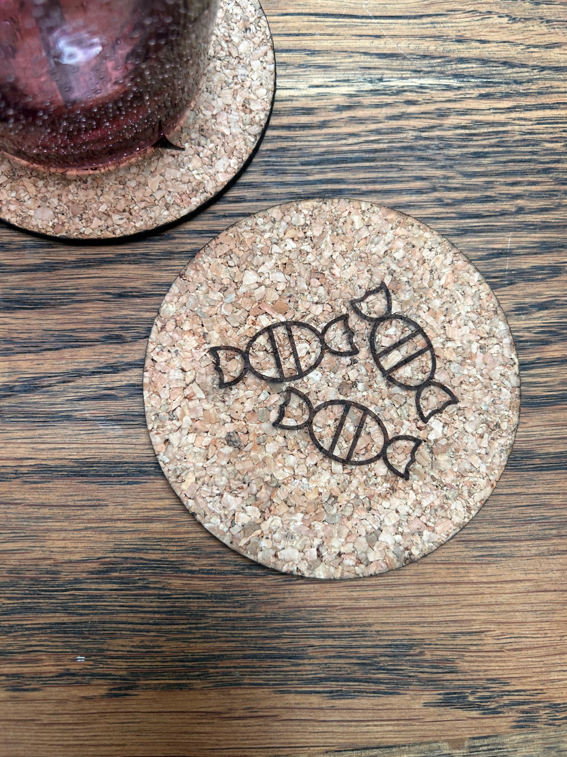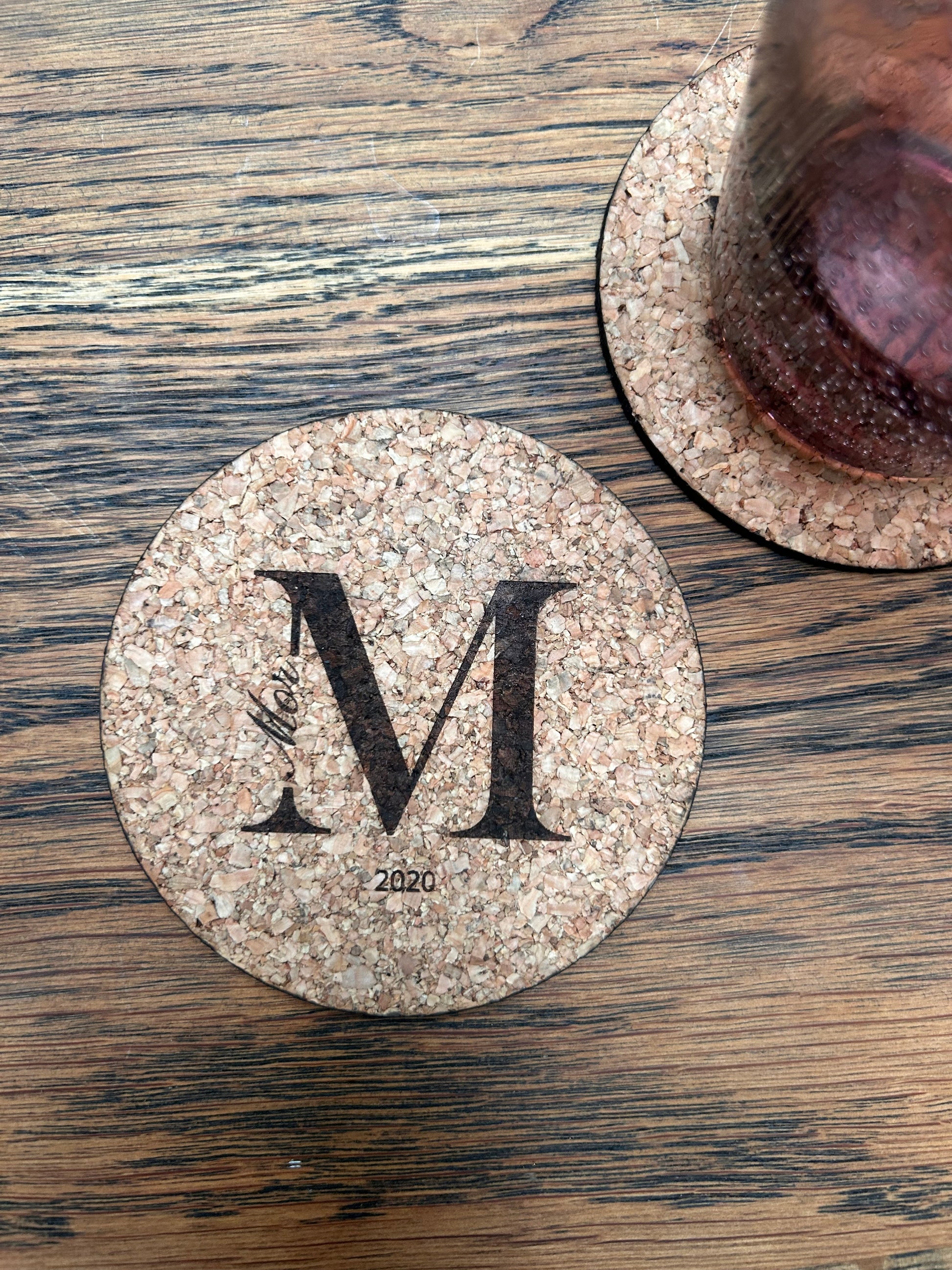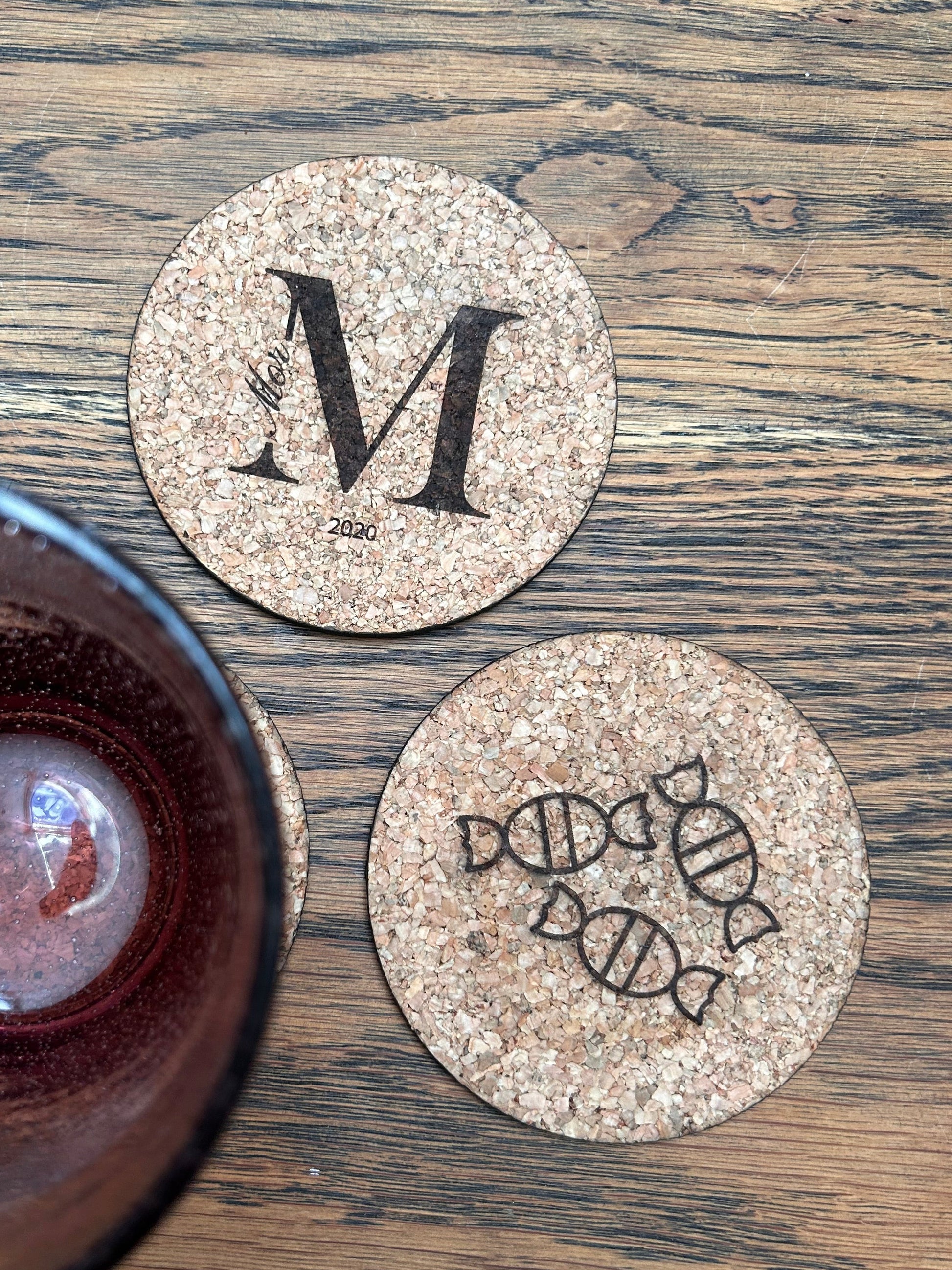 Runde glas brikker lavet i kork med gravering. Vælg imellem ikon gravering eller navn og årstal.